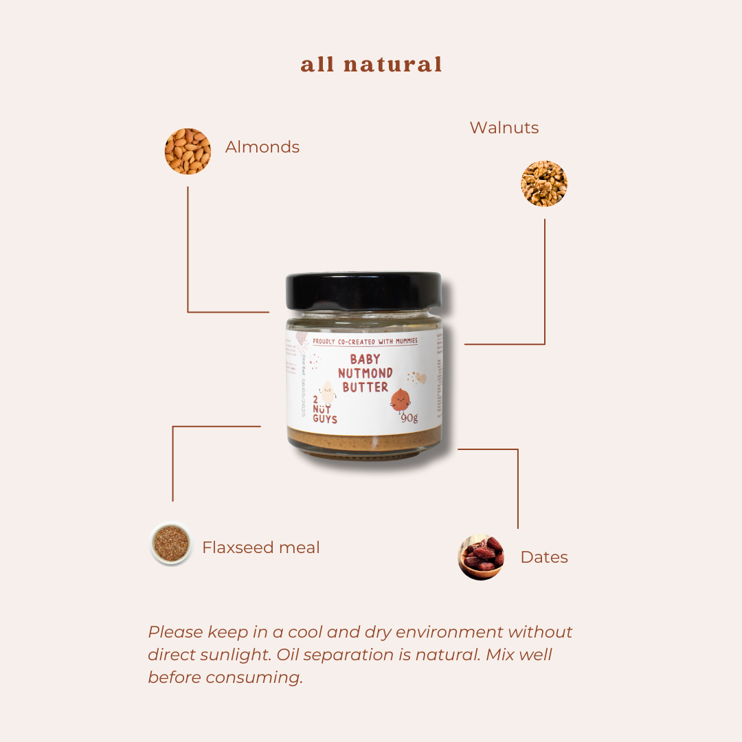 Baby Nutmond Butter is suitable for pregnant mummies and weaning babies. It is part of 2NUTGUYS’ Preggy Series, LittleOne Series and Sugarless Series.