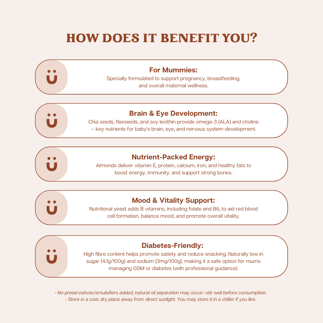 Chia seeds and flaxseeds are rich in plant-based omega-3 fatty acids (ALA), which support your baby’s brain and eye development while also helping to regulate digestion and blood sugar levels — especially helpful during pregnancy. Almonds provide a nourishing blend of vitamin E, healthy fats, protein, calcium, and iron to support your energy, immunity, and your baby’s growing bones. Soy lecithin is a source of choline, an essential nutrient for fetal brain development, and may also help breastfeeding mothers with smoother milk flow by supporting healthy milk ducts. Nutritional yeast adds a natural boost of B vitamins — especially folate and B6 — to aid red blood cell formation, support mood, and promote overall vitality throughout your pregnancy and postpartum journey.