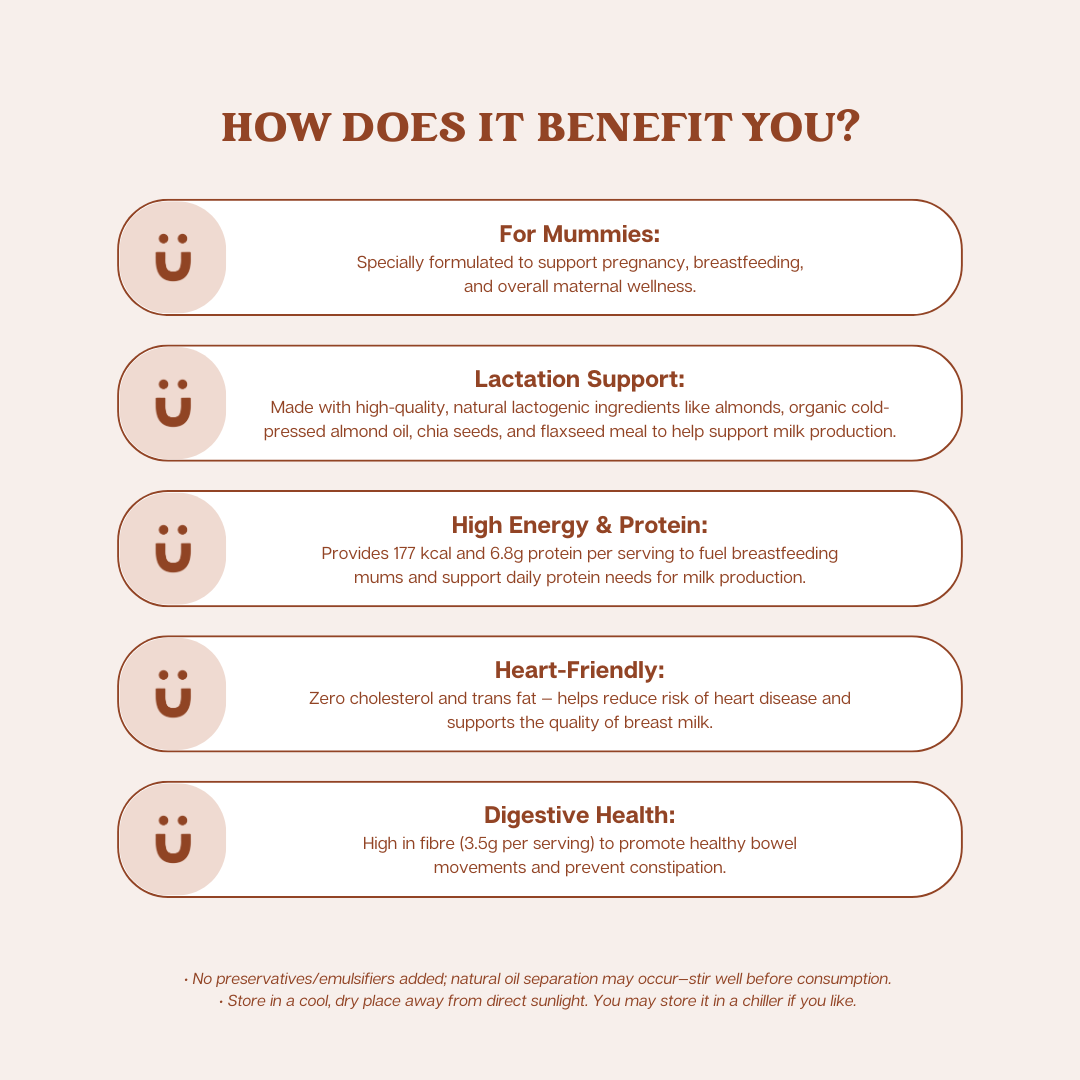 Mummy's Almond Butter - Classic (previously known as Mummy’s Nutmond Butter) is our flagship lactogenic almond butter co-created with more than 30 breastfeeding / nursing mummies. It is made locally in Singapore and packed with lactogenic ingredients like almonds, chia seeds, flaxseed meal, and flavoured with gula melaka to give a twist of asian fusion flavours. It is vegan-friendly and free of cholesterol and trans fat.