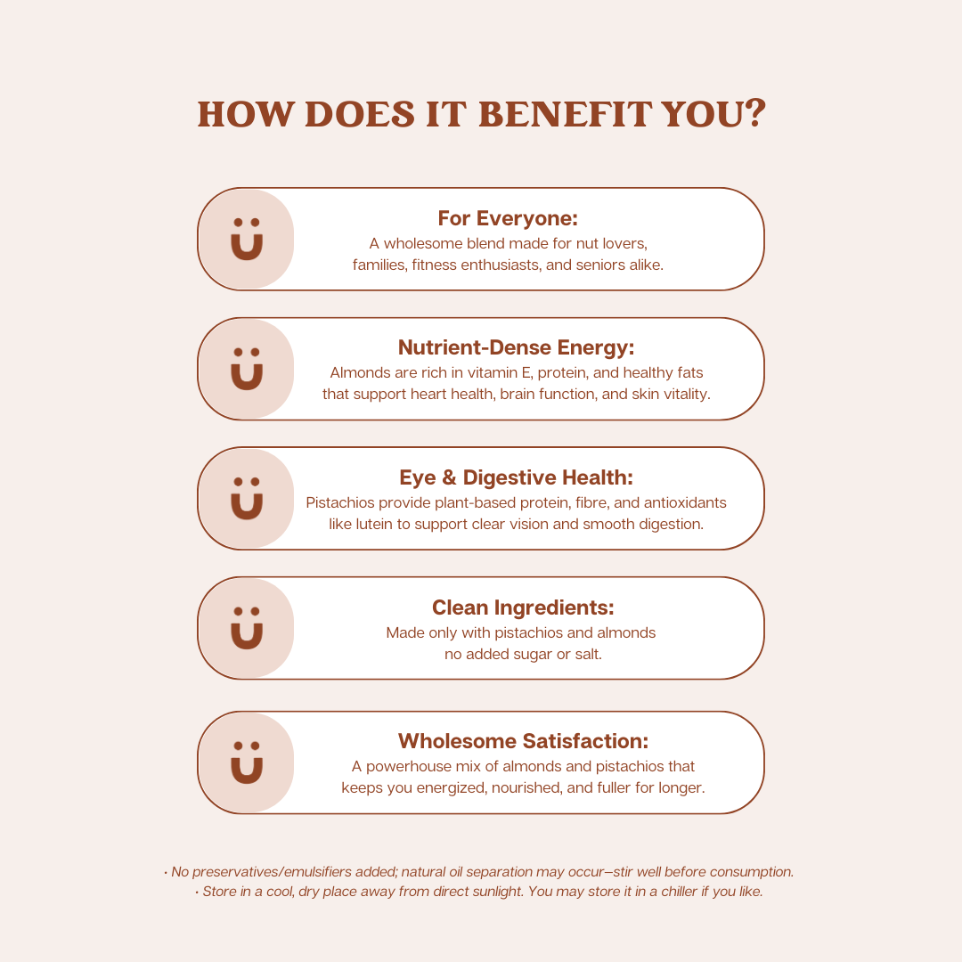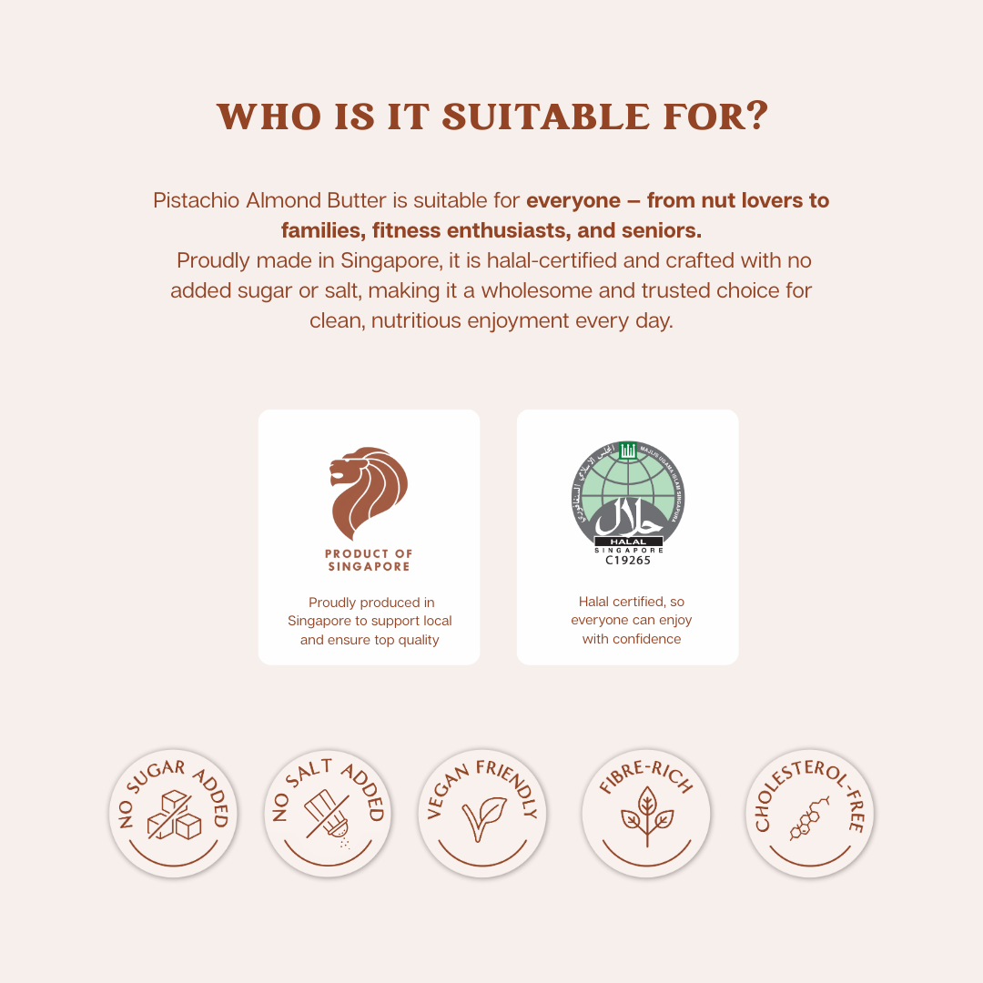 It is suitable for everyone who appreciates pistachios and almonds. Its clean-label formulation — free from added sugar and salt — makes it a better option for anyone, including individuals managing diabetes. However, those with diabetes are encouraged to consult a qualified healthcare professional for personalised guidance on portion intake.