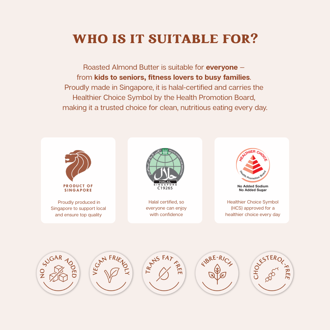 This almond butter is suitable for everyone — from kids to seniors, fitness lovers to busy families. Proudly made in Singapore, it is halal-certified and carries the Healthier Choice Symbol by the Health Promotion Board, making it a trusted choice for clean, nutritious eating every day.